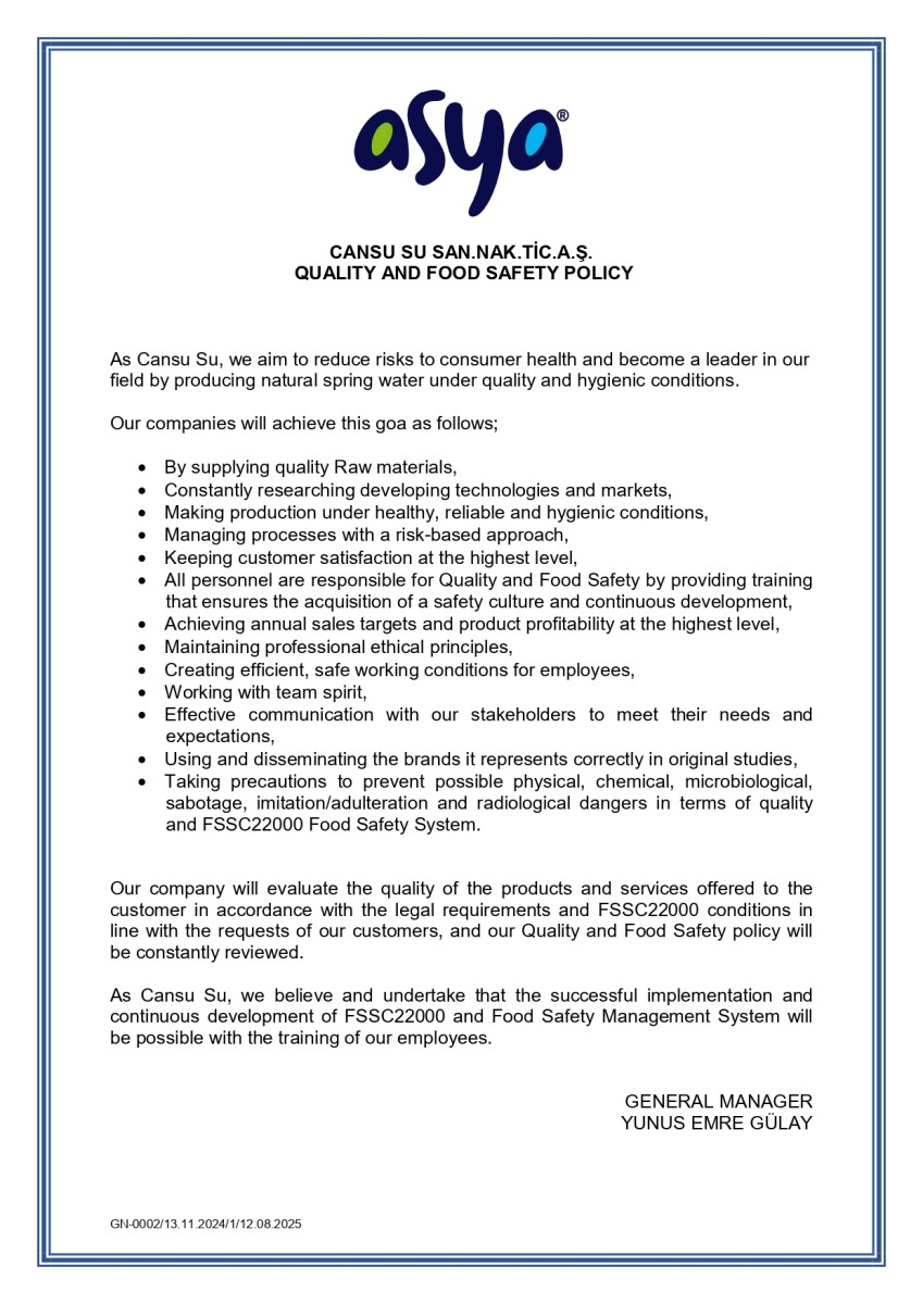 Doğal güzellikler diyarı Düzce’nin 1.160m rakımlı, el değmemiş bir doğa ve bitki örtüsüne sahip KAPLANDEDE DAĞI’nın zirvesinden çıkan Kaynak Suyu, Sağlık Bakanlığı’ndan onaylı, antibakteriyel boru hattıyla %100 güvenli ve hijyenik bir şekilde tesislerimize, son teknoloji ile, el değmeden ve doğallığı bozulmadan da müşterilerimize ulaştırılır. Kendine özgün tadı ve genel tüketicinin beğenisine uygun sertliği ile benzersiz olan Asya Su, Sağlık Bakanlığı tarafından Resmi Gazetede yayımlanan “İnsani Tüketim Amaçlı Sular Hakkında Yönetmelik” şartları uyarınca suyun en sağlıklı ve en doğal halini sunmak için çalışır.